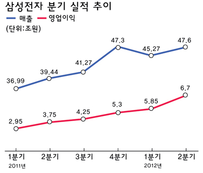 박영주 우리투자증권 연구원은 "영업이익 6조7천억원은 기대치를 소폭 상회하는 수준"이라며 "3분기에도 스마트폰과 반도체를 주축으로 실적 개선 흐름을 이어갈 것"이라고 말했다.