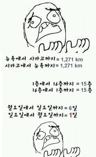 뉴욕에서 시카고까지의 거리는 1271Km고, 반대로 시카고에서 뉴욕까지의 거리도 1271Km로 동일하다. 1층에서 16층, 16층에서 1층까지의 층수도 마찬가지로 동일하다.