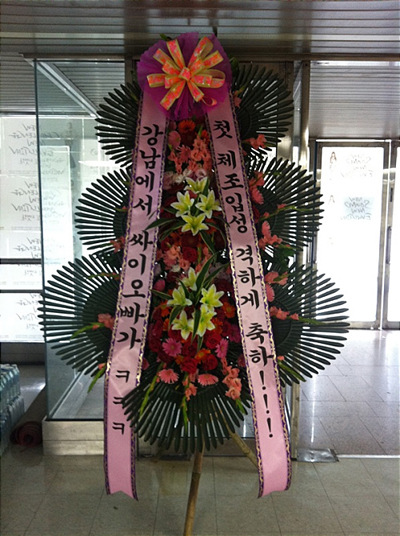 싸이 센스 화환을 본 누리꾼들은 "역시 강남오빠~", "역시 소속가수들끼리 끈끈한 정이 있구나" 등의 다양한 반응을 보였다. (사진=산다라박 미투데이)