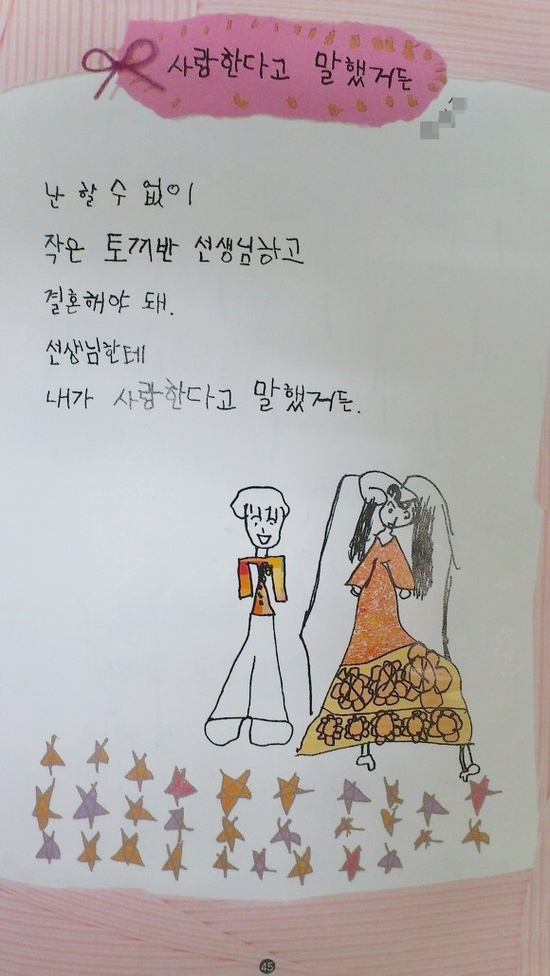 게재된 사진에는 한 유치원생이 '사랑한다고 말했거든'이라는 제목의 짧은 글과 남녀가 결혼식을 올리는 그림이 함께 담겨 있다.