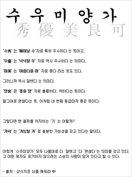 게시물은 초등학교 성적 등급인 수우미양가의 의미를 각각 풀어 설명하고 있다. ‘수’는 잘했고 ‘가’는 못했다는 통념과는 조금 다른 해석을 하고 있다.
