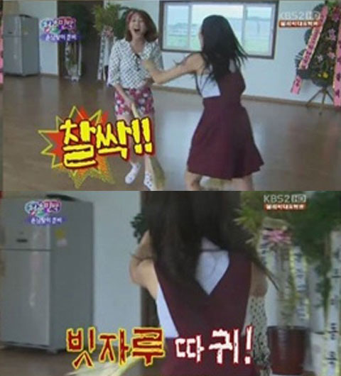 수지 실수가 화제다. 미쓰에이 멤버 수지가 카라 강지영에게 실수로 빗자루 따귀를 날린 것.