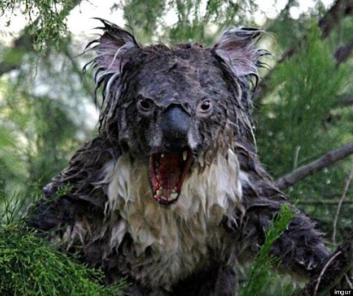 그렘린 닮은 코알라 사진에는 코알라가 비에 젖어 있는 모습이 마치 영화 속 괴물 그렘린을 모는 듯 하다.