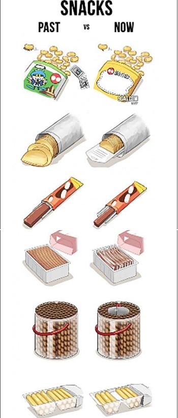 그림을 보면 과거의 과자보다 현재의 과자는 포장이 더 과해져 과자의 양이 현저히 줄어든 것을 알 수 있다.
