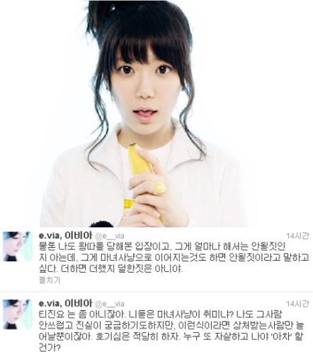 이비아는 지난 30일 자신의 트위터에 “티진요는 좀 아니잖아. 니들은 마녀사냥이 취미냐? 나도 그 사람 안쓰럽고 진실이 궁금하기도 하지만 이런 식이라면 상처받는 사람만 늘어날 뿐이잖아. 누구 또 자살하고 나야 ‘아차’ 할 건가?”라는 글을 게재했다.