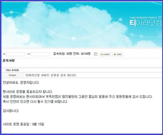 이로서 티아라의 최대 팬 커뮤니티가 8월 15일 자로 폐쇄를 알리며 티아라는 최대 팬 사이트를 잃게 됐다.