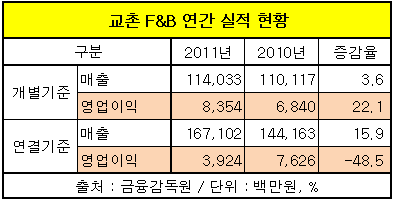 1일 금융감독원에 따르면 교촌에프앤비는 개별기준 실적만 따졌을 때 지난해 2011년 매출 1천140억3천300만원에 영업이익 83억원을 기록했다. 매출은 전년 대비 3.6%, 늘고, 영업이익은 22.1%나 증가한 수치다.