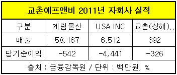 중국에 진출한 ‘교촌(상해)찬음관리유한공사’도 매출(3억9천200만원)에 육박하는 규모의 적자(3억2천600만원)를 기록했다.