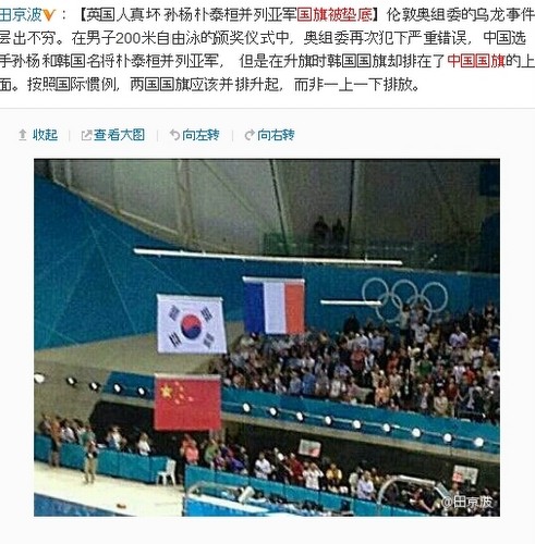 런던올림픽 수영 남자 200m 자유형 경기 시상식에서 중국의 국기 게양 실수가 발생해 논란이 일고 있다.