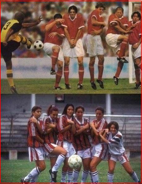 사진은 축구 경기 도중 프리킥 상황에서 남자와 여자가 보호하는 부분이 다르다는 점을 보여준다.