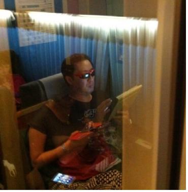 하하가 공개한 사진에서 정준하는 KTX 좌석에 앉아 물안경을 쓰고 아이패드에 열중하고 있다.