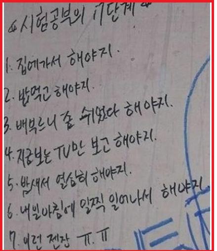 공개된 '시험기간 마음가짐 7단계' 중 1단계는‘집에 가서 해야지’, 2단계는 ‘밥먹고 해야지’, 3단계는 ‘배부르니 좀 쉬었다 해야지’, 4단계 ‘지금 보는 TV만 보고 해야지’, 5단계 ‘밤새서 열심히 해야지’, 6단계 ‘내일 아침에 일찍 일어나서 해야지’라고 하지만 결국 7단계에서 ‘이런 젠장’이라고 말한다.