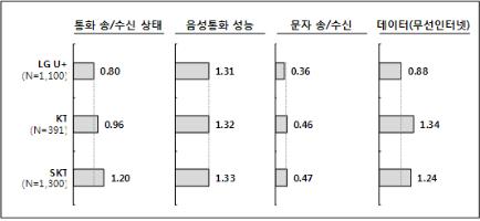 음성통화 성능상의 문제점 역시 LG유플스 1.31건으로 KT(1.31건)와 SK텔레콤(1.33건)을 간발의 차로 따돌렸다.