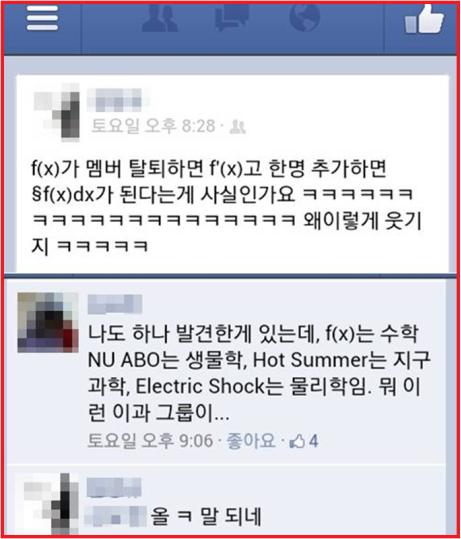 공개된 게시물의 내용은 "걸그룹 f(x)가 탈퇴하면 f'(x)고, 한 명 추가하면 ∮f(x)가 된다는 게 사실인가요"라는 질문을 던졌다.