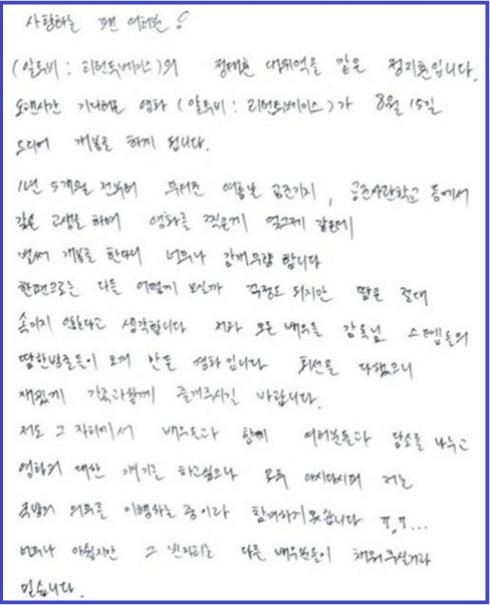 2일 영화 '알투비: 리턴투베이스'(김동원 감독) 제작사 측은 군 복무중인 비의 친필편지를 공개했다.
