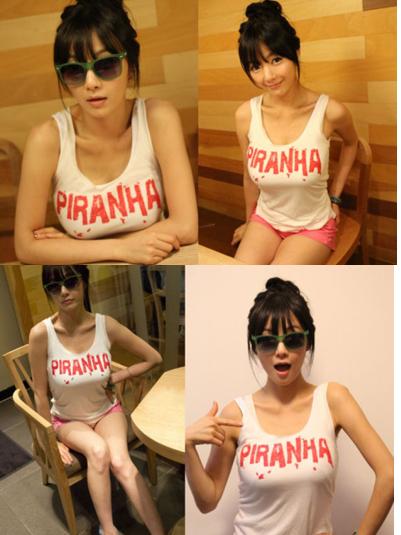 공개된 사진에서 정수정은‘피라냐(PIRANHA)’라는 글씨가 프린트 된 셔츠를 입고 선글라스를 쓰고 있다.