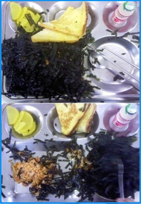 ‘위장 중인 급식’ 사진에 누리꾼들은 "밥보다 김이 많네", "볶음 밥의 은신술", "김가루만 잔뜩있네"등의 재밌다는 반응을 보였다. (사진-온라인 커뮤니티)