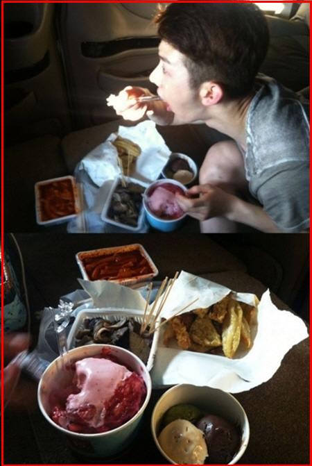 조권은 2일 자신의 트위터에 "올림픽 보며 열을 식히기 위해. 그리고 배가 고파.. 차 안에서 떡볶이, 순대, 튀김, 딸기 빙수, 아이스크림을"이라는 글과 함께 두 장의 사진을 게재했다.