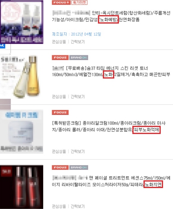 그러나 오픈마켓에서는 이같은 화장품 광고 가이드라인이 무색하게 ‘여드름치료, 트러블예방, 피부재생, 노화예방, 아토피치료·예방, 튼살 크림’ 등 기능성을 앞세운 광고 문구들이 난무했다.