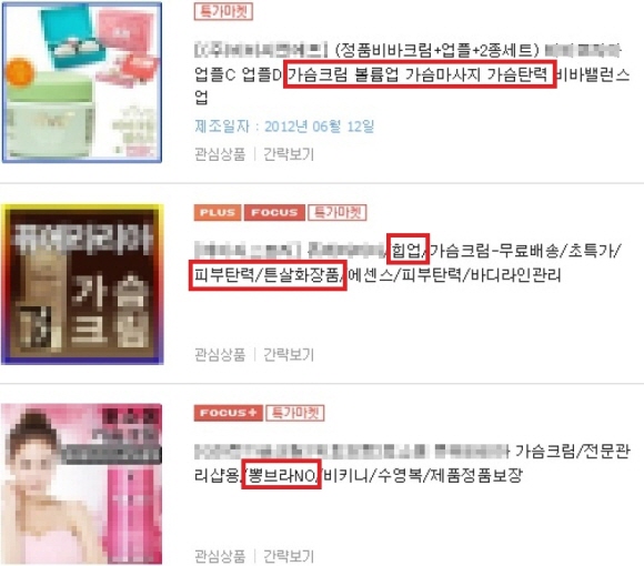 특히 지난해 문제가 됐던 '가슴 확대 크림'은 모든 오픈마켓에서 '볼륨 업' '뽕브라NO' 등의 표현으로 대체되어 여전히 판매되고 있었다.