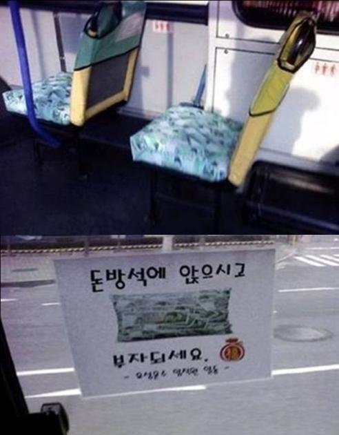 최근 인터넷에 올라온 '어느 버스 회사 센스' 게시물에는 버스 좌석에 만원 짜리 지폐 그림이 그려져 있다.