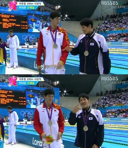 나란히 은메달을 목에 건 수영선수 박태환과 쑨양이 훈훈한 모습을 보였다.