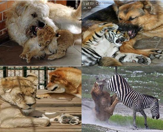해당 사진에는 새끼 사자와 호랑이가 개에게 괴롭힘을 당하는가 하면 먹이를 추격하던 사자가 얼룩말 뒷발에 얼굴이 채이는 굴욕적인 모습이 담겨있다.