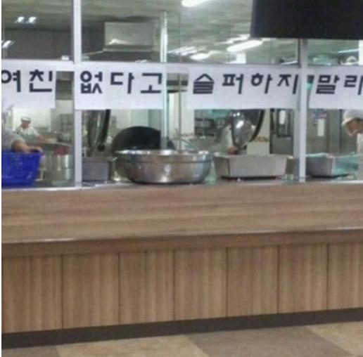 해당사진은 한 남자 고등학교의 급식실을 찍은 것으로 배식대 윗 부분에 큼지막한 글씨로 '여친 없다고 슬퍼하지 말라'는 문구가 쓰여 있다.