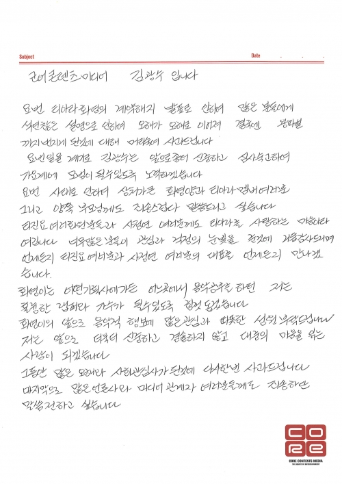 코어콘텐츠미디어 김광수 대표가 4일 오전 ‘티아라 사태’와 관련해 자필로 쓴 사과문을 공개했다.