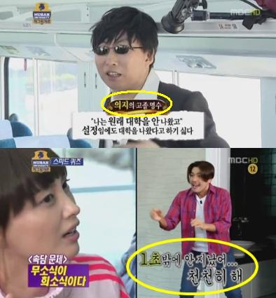 박명수가 자기 소개 중 ‘의지의 고졸’이란 자막이 등장한 것. 이는 최근 대두된 걸 그룹 티아라 사태에 티아라 멤버들이 자신들의 트위터에서 ‘의지’ 발언을 한 것을 절묘하게 풍자한 것이라는 지적이다.