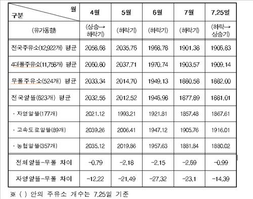 반면 앞서 한국석유공사가 파악한 평균 가격으로 보면 지난달 25일 기준으로 전국 10개 광역시·도에서 알뜰 주유소가 무폴보다 휘발유를 비싸게 파는 것으로 나타났다.