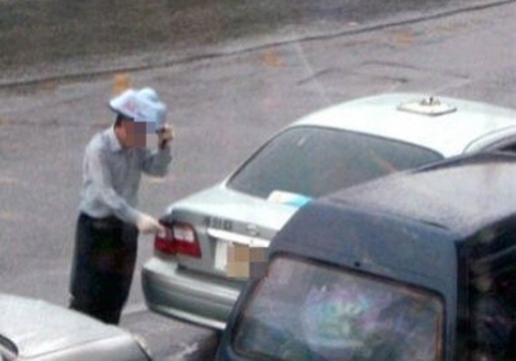 사진 속 등장하는 택시기사는 비오는날 트렁크에서 뭔가를 꺼내려하고 있다. 주목되는 점은 택시기사가 비를 피하기 위해 쓴 것. 우산이 아닌 택시 위에 놓는 야간 식별등이었다.