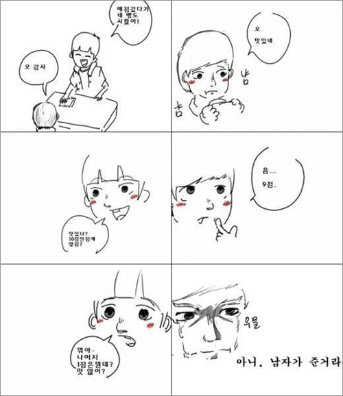 웹툰에 등장하는 한 남학생은 친구에게 빵을 받는다. 빵을 준 친구는 빵 맛에 대한 점수를 매기라고 묻고 이에 남학생은 잠시 머뭇거리더니 “9점”이라고 답한다.