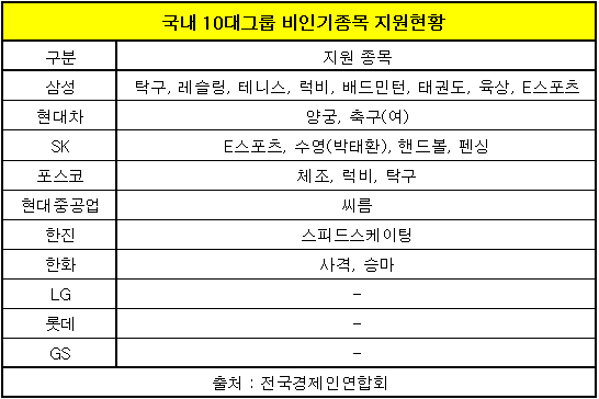 그러나 10대그룹 가운데 LG와 롯데, GS그룹은 프로구단을 운영할 정도로 스포츠에 관심을 보이면서도 비인기종목 지원은 없어 대조를 이뤘다.