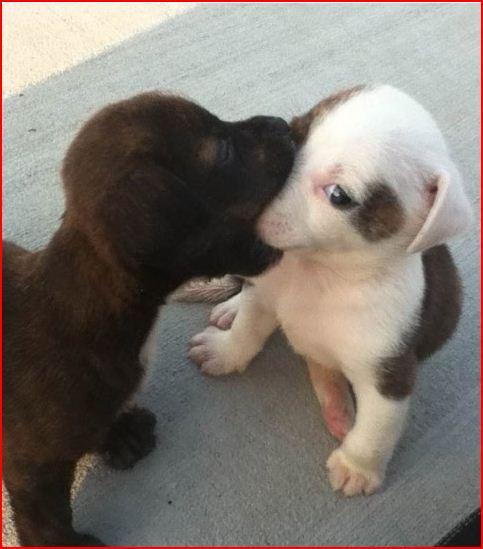 갈색 강아지가 흰색 점박이 강아지의 주둥이를 물고 있는 가운데, 갈색 강아지의 입 냄새를 참아야 하는 흰 강아지의 애처로운 눈빛이 웃음을 자아낸다.