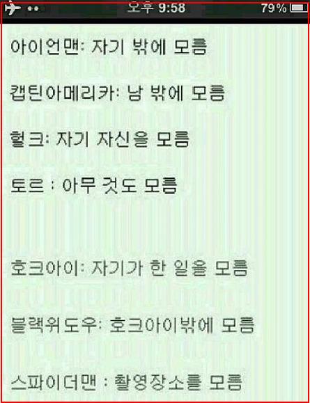 캡틴아메리카’는 남밖에 모르고, '헐크'는 자기 자신을 모르며 '토르'는 아무 것도 모른다고 돼 있어 웃음을 자아낸다.