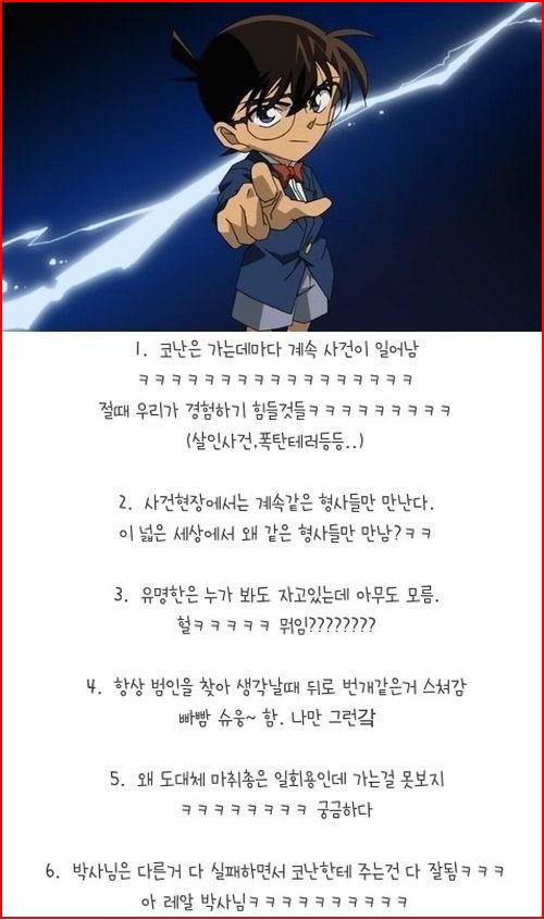 특히 가장 누리꾼들의 공감을 이끌어내는 것은 주인공이 가는 곳마다 일상생활에서는 쉽게 접할 수 없는 살인, 납치, 폭탄테러 들의 사건이 일어나는 것이다. 코난이 사건을 부르는 것인지 아니면 일부러 사건을 만드는 것인지 알 수 없을 정도.