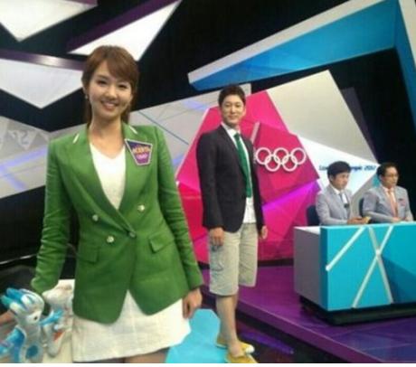 공개된 사진에서 오정연 아나운서 뒤로 한석준 아나운서가 정장차림 아내로 반바지를 입고 있는 모습이 웃음을 준다.