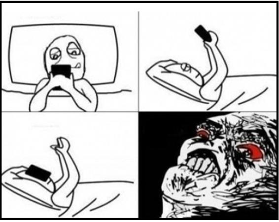 이 게시물에는 자기 전 휴대폰을 보는 사람을 만화로 그린 것이다.