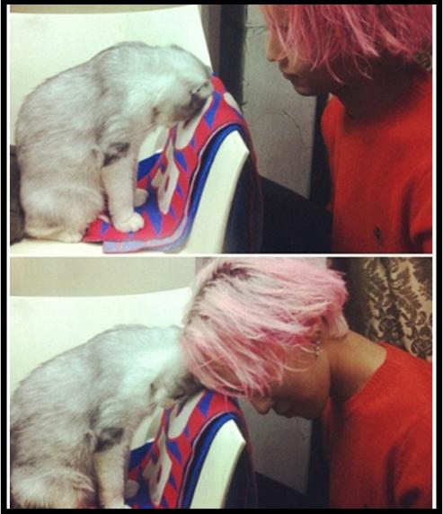 공개된 사진 속 지드래곤은 의자에 앉은 고양이와 함께 머리를 맞대고 있다.