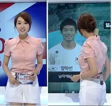 김민지 아나운서가 양학선 선수의 소개 중 뒤를 돌자 얇은 소재의 바지에 속옷이 비쳤던 것이다.