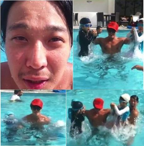 공개된 영상에서 김종국은 수영장에서 아이들을 양손으로 들어올리고 있다.