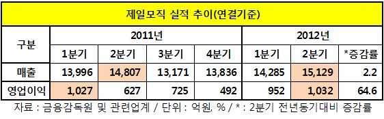 금융감독원에 따르면 제일모직은 올해 2분기 매출과 영업이익 각 1조5천129억원, 1천32억원을 달성해 분기기준으로 사상 최대 실적을 기록했다. 매출은 전년대비 2.2% 신장했고, 영업이익은 64.6%나 신장해 어닝서프라이즈 수준이다.