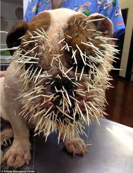 호저로도 알려진 산미치광이와의 싸움 끝에 가시투성이가 된 불도그의 모습이 공개돼 관심을 모으고 있다.