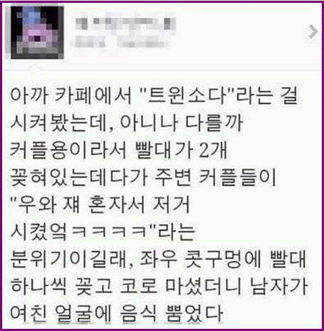 솔로의 패기 사진에 따르면 한 솔로는 실수로 커플용 솔로를 주문했는데 트윈소다라는 음료 이름답게 빨대가 두 개가 나왔다.