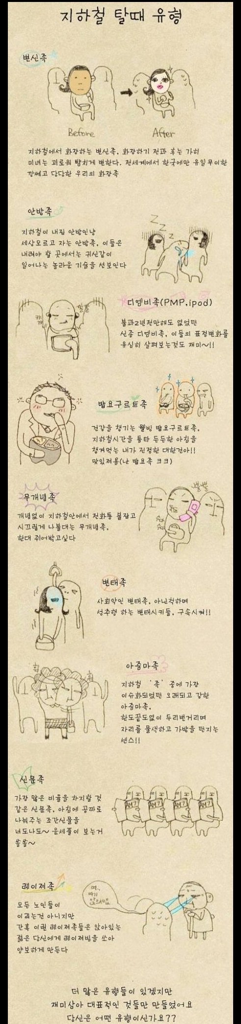 그림을 보면 지하철 안에서는 화장하는 ‘변신족’, 안방인냥 잠을 자는‘안방족’, 지하철에서 시끄럽게 통화하는 '무개념족'등 다양한 유형의 사람들이 있다.