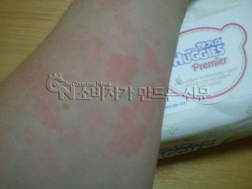 물티슈를 사용한 아기와 아내 피부에 붉게 피부 발진이 일어났다. 처음에는 대수롭지 않게 넘기다 지속적인 증상에 의심이 든 서 씨는 자신의 팔에 직접 테스트를 해 봤다.
