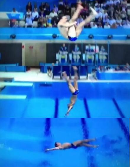 이날 출전한 독일 선수 슈테판 펙은 3바퀴 반을 회전하려고 했으나 회전 중 균형을 잃어 등부터 물에 떨어지고 말았다.