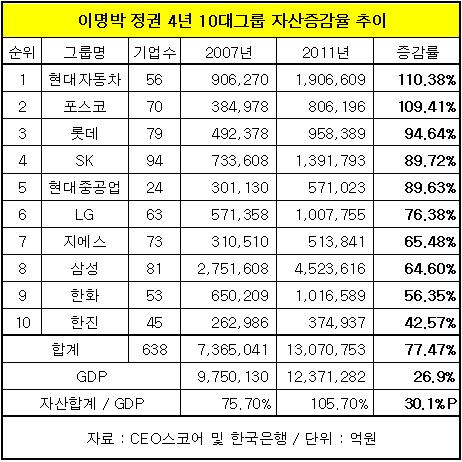 이 수치는 2007년 75.7%에서 2011년 105.7%로 무려 30.1%포인트 증가했다. 심지어 2011년에는 10대 그룹의 자산이 GDP를 추월하기도 했다.
