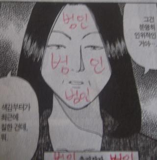 공개된 사진 속에는 만화책의 한 장면이 담겨져 있었는데, 등장인물의 얼굴에 빨간 펜으로 범인이라고 수차례 적어놨다.
